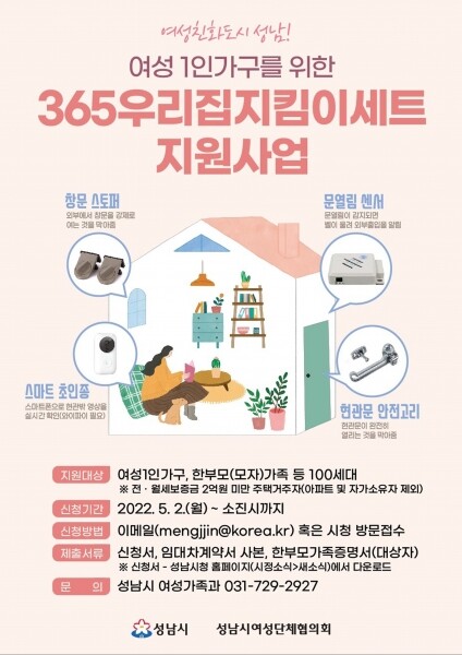성남시 여성가족과 관계자는 “무단 주거침입과 성폭력 등 범죄에 대한 여성들의 불안감을 해소하기 위해 올해로 2년째 우리집 지킴이 4종 세트 지원사업을 펴고 있다”고 말했다.