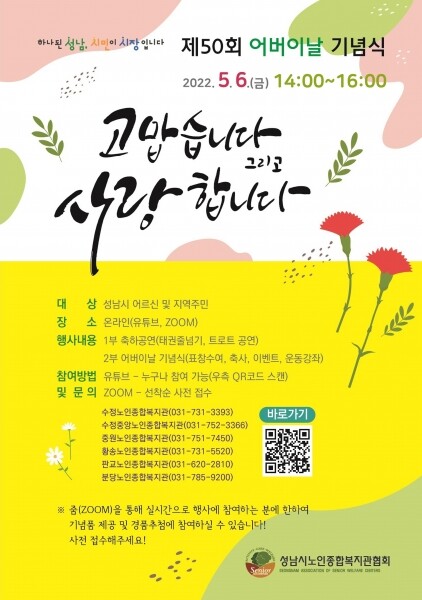 성남시노인종합복지관협회가 주관하는 이날 행사는 수정중앙노인종합복지관 유튜브로 생방송 해 시민 누구나 시청할 수 있다.