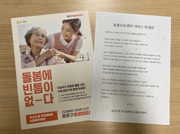 한편 종로구 돌봄SOS센터는 거동이 불편하나 수발할 수 있는 가족이 없거나 불가피한 이유로 돌봄 공백이 발생한 장애인, 50세 이상 중장년 주민 등을 대상으로 일시재가 영양지원 신선식단 위생지원 세탁지원 단기시설 동행지원 안부확인 건강지원 돌봄제도 사례관리 긴급지원에 이르는 총 12대 서비스를 제공하고 있다.
