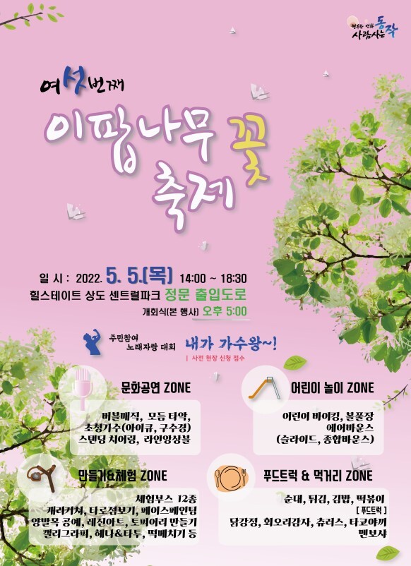 5월에 활짝 피는 이팝나무 꽃은 흰색의 쌀밥 같은 재밌는 모양을 가진 봄꽃으로 상도역사거리에서 상도로 봉천고개구간으로 이어지는 동작구 상징거리 ‘이팝나무 거리’ 꽃길의 아름다움을 주민들과 함께 나누는 동작구 대표 축제다.