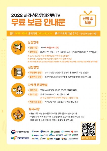 신청 방법은 주소지 관할 주민센터를 방문하거나 TV보급 홈페이지를 통해 본인인증 후 신청할 수 있으나 2016년부터 2021년까지 시·청각장애인용 TV를 지원받은 사람은 제외된다.