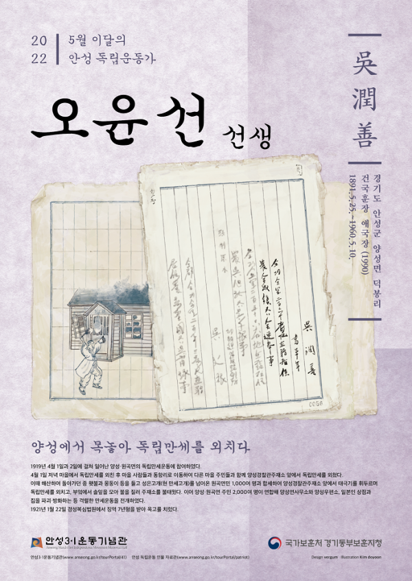 오윤선 선생은 1919년 4월 1일과 2일에 걸쳐 일어난 양성면·원곡면의 독립만세 시위에 참여했다.