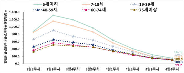 모든 연령대의 일평균 발생률이 전주 대비 감소했으나, 9세 이하 연령군에서 여전히 가장 높은 발생률을 유지 중이다.