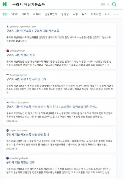그러나, 현재 포털사이트 네이버에서 “구리시 재난기본소득”을 검색하면 “휴대폰 분실 보호 이용 서비스” 등을 유도하는 광고가 표시되는 가짜사이트가 나타났다.