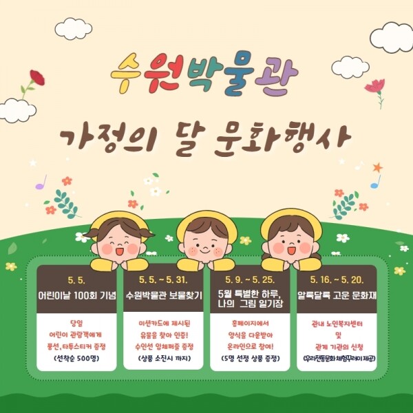 수원박물관 관계자는 “어린이날과 가정의달의 의미를 되새기고 가정의 달에 소외감을 느낄 수 있는 기관을 위한 프로그램을 마련했다”며 “많은 어린이와 가족, 시민들이 함께 참여하고 즐길 수 있는 시간을 만들겠다”고 말했다.
