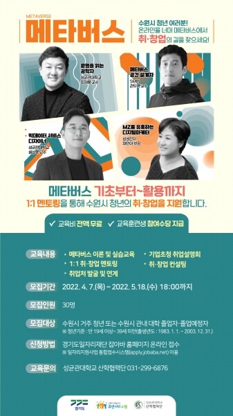 메타버스 가상융합플랫폼 전문인력 양성 지원사업은 청년들을 대상으로 메타버스 이론·실전 교육, 전문가 1:1 멘토링 등을 진행해 청년들이 실무능력을 키울 수 있도록 지원하는 실전 중심 교육과정이다 체계적인 취·창업 지원 프로그램을 운영해 수료자의 관련 업계 취·창업도 지원한다.