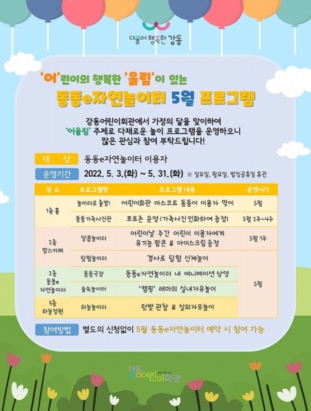 2년 넘게 장기화된 코로나로 누구보다 답답했을 어린이들을 위해 5월 내내 강동구 곳곳에서 신나게 즐길 수 있도록 재미있고 다양한 프로그램들을 운영한다.