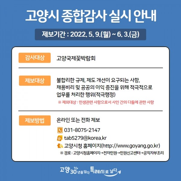 이번 감사는‘2022년 고양시 자체감사 기본계획’에 따라 기관운영 업무전반에 대해 실시하는 종합감사로 위법·부당한 행정행위 각종 화훼산업 관련 예산낭비 채용비리 소극행정 업무처리 등을 중점적으로 확인할 예정이다.