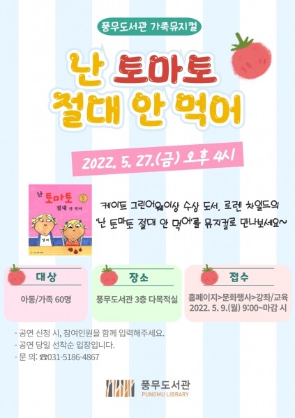 오는 5월 27일 오후 4시에 풍무도서관 다목적실에서 진행되며 아동 및 가족 60명이 참여 가능하다.