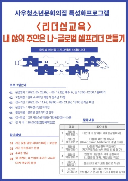 1기 참가자는 초등 4~6학년 연령 청소년이 대상으로 15명을 모집하는데 오는 5월 11일 9시부터 5월 21일 오후 6시까지 김포시 청소년재단 홈페이지 통합접수시스템을 통해 프로그램 참가 신청이 가능하다.
