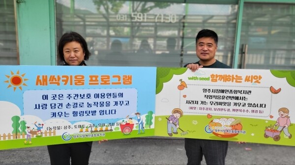 ㈜예성아름터가 후원한 두 개의 프로그램 간판은 힐링텃밭에서 이용인들이 농작물을 심고 가꾸는 ‘새싹키움’과 ‘함께하는 씨앗’의 내용을 담고 있다.