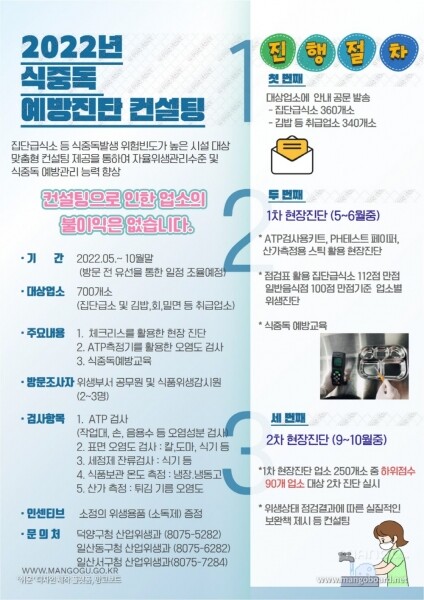 식중독 예방진단 컨설팅은 여름철 식중독 발생 위험이 높은 김밥, 회, 육회 등을 취급하는 소규모 식품접객업소와 위생관리가 취약한 집단급식소 250개소를 대상으로 한다.