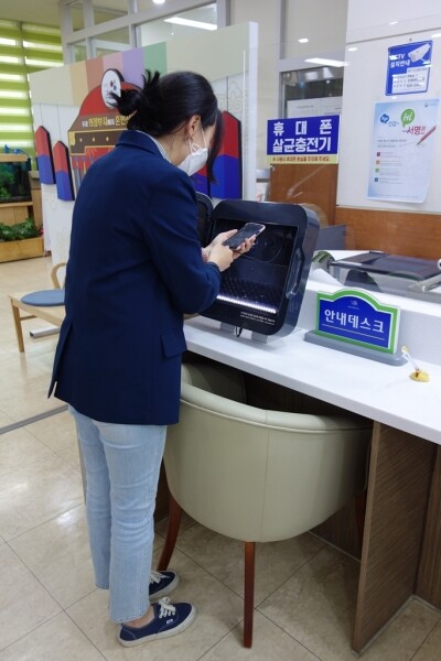 이번에 설치 된 휴대폰 살균충전기는 자외선 살균기능과 최대 4대까지 급속충전이 동시에 가능해 민원처리를 위해 방문한 민원인들이 각종 업무처리를 위한 대기시간에 휴대폰 살균충전기를 간편하게 이용 할 수 있다.