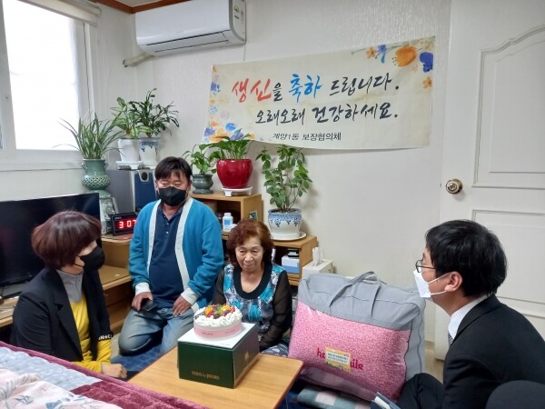 이번 방문에서 계양1동 보장협의체들은 어르신 가정 5세대를 직접 방문해 생신을 축하해드리고 케익과 이불 1채 등을 선물로 드렸다.