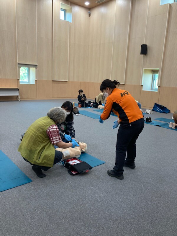 구리시소방서 전문 강사가 실제 응급상황 발생 시 신고요령, 심폐소생술방법, 자동심장충격기 사용법 등 이론과 실습을 병행하고 교육생들은 마네킹을 활용해 심폐소생술을 직접 실습했다.