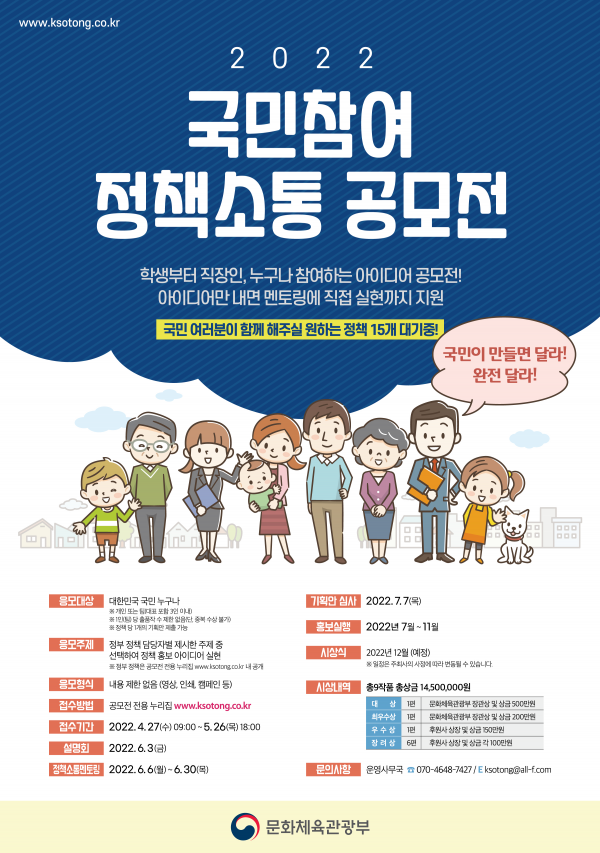 전년도 대상 수상자인 정유진 씨는 “나의 작은 생각이 여러 사람에게 영향을 미칠 수 있다는 점, 소소한 아이디어가 소통 실행을 통해 멋진 사업으로 발전하는 과정에서의 배움과 만족감에 커다란 매력을 느꼈다”며 “아주 작고 별것 아닌 아이디어라 생각해도 충분히 가능성 있고 멋진 정책홍보로 거듭날 수 있으니 많은 국민들이 꼭 참여하길 바란다”고 밝혔다.