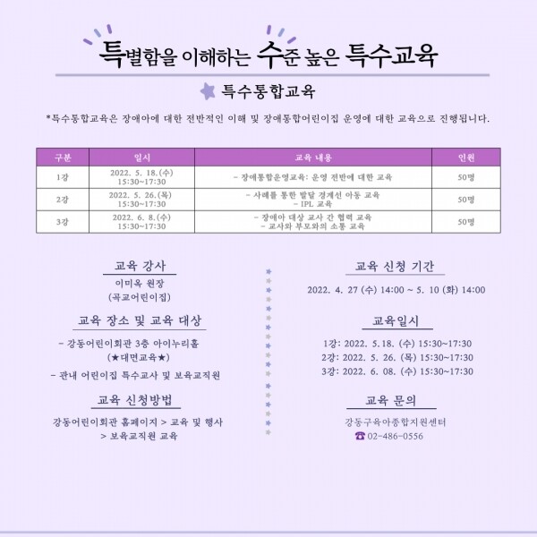 교육 대상자는 관내 어린이집 특수교사 및 보육교직원이며 강동어린이회관에서 대면 교육으로 진행할 계획이라고 전했다.