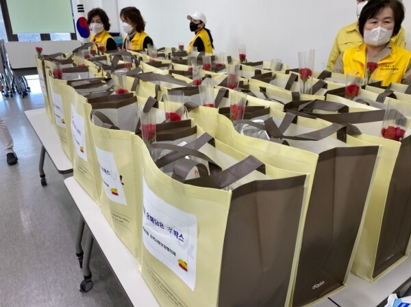 배곧2동 지역사회 보장협의체 특화사업으로 진행된 이번 행사를 통해 경제적·물리적 어려움을 겪고 있는 홀몸 어르신들의 외로움을 위로하고자 카네이션, 식료품, 생활용품 등으로 다양하게 구성한 효 박스를 제작했다.