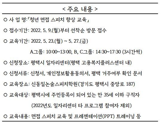 교육신청은 평택시민임을 증명할 수 있는 신분증이나 등본 등을 지참해 평택시 일자리센터에 직접 방문해 신청하면 된다.