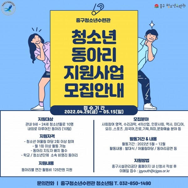 청소년동아리활동 지원사업은 청소년활동 진흥법 제64조에 의거, 청소년들이 자립적종합적인 동아리 활동을 통해 다양한 특기를 계발체험하고 인성사회적 함양의 기회를 제공하며 청소년 문화참여활동 참여를 높이기 위한 사업이다.