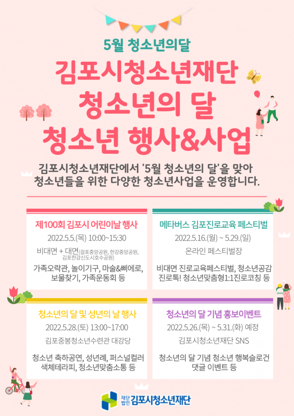 ‘5월 청소년의 달’을 맞아, ‘제100회 김포시 어린이날 행사’, ‘메타버스 김포진로교육 페스티벌’, ‘청소년의 달 및 성년의 날 행사’, ‘청소년의 달 기념 홍보이벤트’ 등 다양한 청소년행사를 운영하며 권역별 청소년시설에서는 국가인증수련활동, 학교연계사업, 청소년문화활동 등 다채로운 청소년사업을 활발히 진행하고 있다.