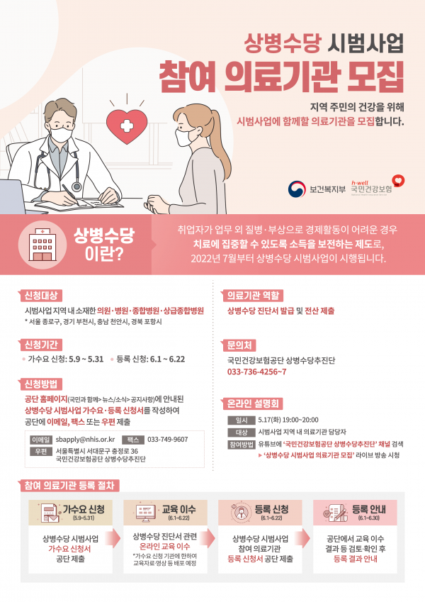 아울러 5월 17일에는 유튜브 라이브방송을 통해 상병수당 시범사업 및 참여 의료기관의 역할 등에 대해 안내할 계획이라고 전했다.