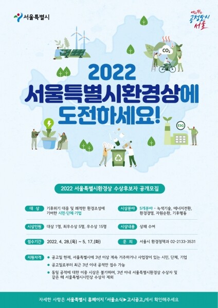 올해 26회를 맞이하는 서울특별시환경상은 녹색기술·에너지전환·환경경영·자원순환·기후행동 총 5개 분야에서 대상 1명, 최우수상 5명, 우수상 15명 등 총 21명을 선정해 시상한다.