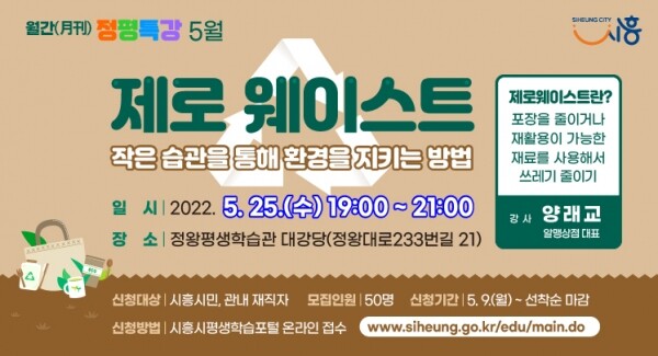오는 25일 정왕평생학습관 대강당에서 열릴 5월 정평특강은 우리나라 최초 리필스테이션 매장인 ‘알맹상점’ 양래교 대표와 함께 ‘제로웨이스트’라는 주제로 일회용품 사용문제에 대해 함께 고민하는 시간을 갖는다.