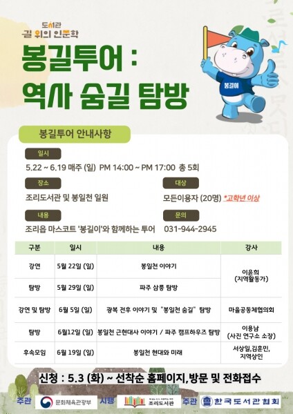 ‘봉길투어: 봉일천 역사 숨길 탐방’ 프로그램은 문화체육관광부가 주최 및 한국도서관협회가 주관하는 ‘도서관 길 위의 인문학’ 공모 사업으로 회차별 20명 선착순으로 접수를 받아 강의와 더불어 조리읍 마스코트 ‘봉길이’와 봉일천 일대를 탐방한다.