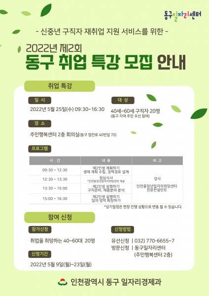 모집인원은 20명 내외로 신청 희망자는 20일까지 주민행복센터 2층 동구 일자리센터로 전화 또는 방문 접수하면 된다.