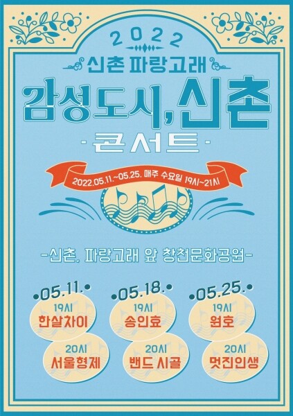 서대문구는 ‘신촌, 파랑고래’ 개관 3주년을 맞아 이달 11일과, 18일 25일 저녁 7시부터 9시까지 창천문화공원에서 ‘2022 감성도시, 신촌 콘서트’를 개최한다고 밝혔다.