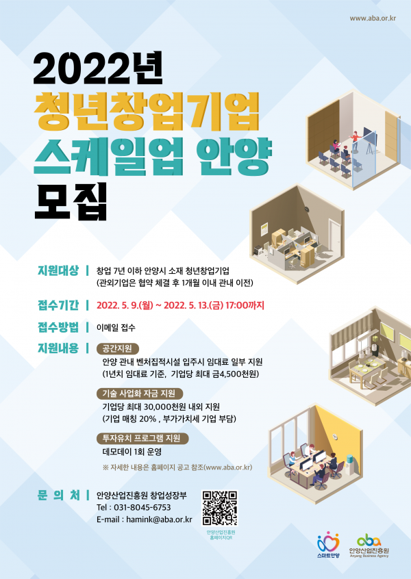 본 사업은 안양시 소재 또는 안양시로 본사를 이전할 예정인 창업 7년 이내 청년창업기업 대상으로 하며 기술사업화 지원금과 투자유치 프로그램, 벤처집적시설 입주시 임대료지원 등 ‘자금·투자·공간 지원 종합 패키지’ 지원 사업이다.