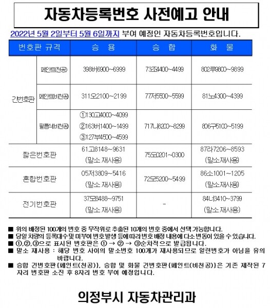 발급 예정 차량번호 확인은 의정부시 자동차관리과 홈페이지의 사전 예고 메뉴에서 확인 가능하며 매주 금요일마다 다음 주 발급 예정 번호가 게시된다.