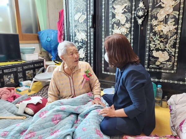 이날 염명희 면장은 지역 최고령 어르신에게 카네이션을 직접 달아드리며 장수축하물품을 전달했다.