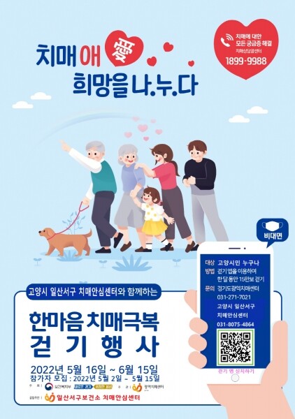 신청은 본인 휴대전화를 이용해 모바일 앱 ‘워크온’을 설치 및 가입하고 ‘2022년 경기도 한마음 치매극복 걷기행사’ 커뮤니티에 참여 후 그룹 설정을 ‘고양시 일산서구’로 지정 후 챌린지 참여하기를 누른 뒤 휴대전화를 몸에 지니고 걷기를 실천하면 된다.