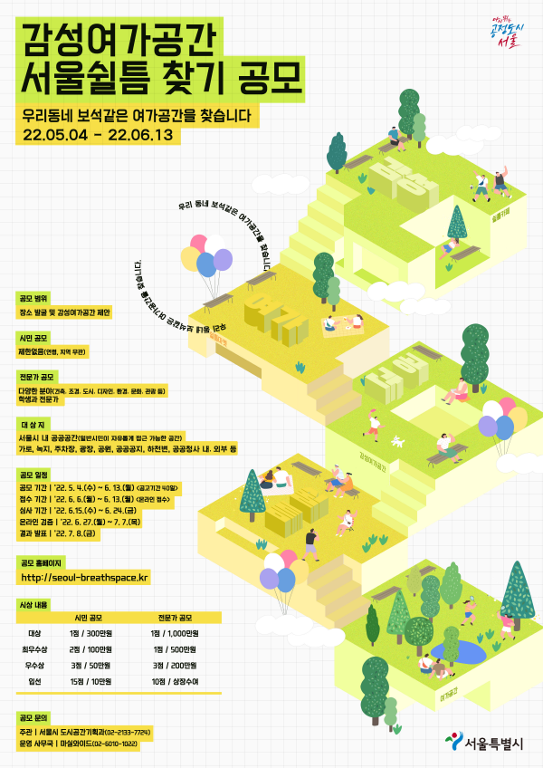 서울시는 오는 6.13까지 ‘감성여가공간, 서울쉴틈 찾기’ 공모를 진행한다고 밝혔다.