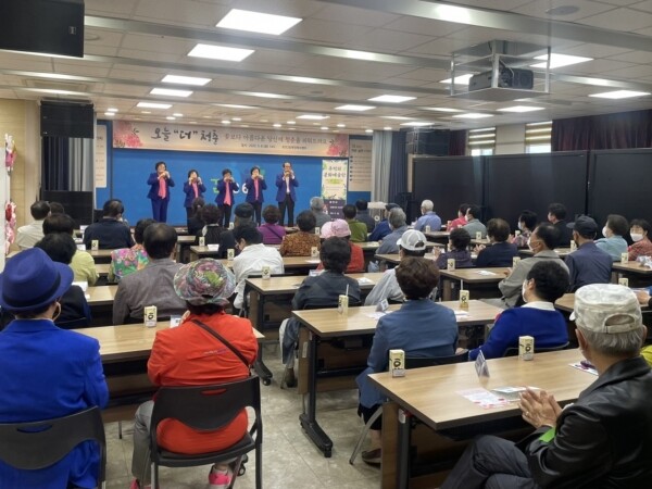 이날 재능기부자들의 노래, 하모니카 연주 등 기념공연이 진행됐으며 회천2동 공립지역아동센터 아이들이 직접 만든 카네이션과 손편지를 어르신들에게 전달했다.