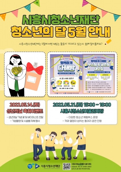 먼저 오는 14일에는 성년을 맞이한 청소년들을 축하하는 성년의 날 이벤트가 시흥시청소년수련관 및 관내 청소년 문화의집 10개소에서 열리며 참가자들에게 장미꽃 및 바디미스트 등 소정의 기념품을 증정한다.