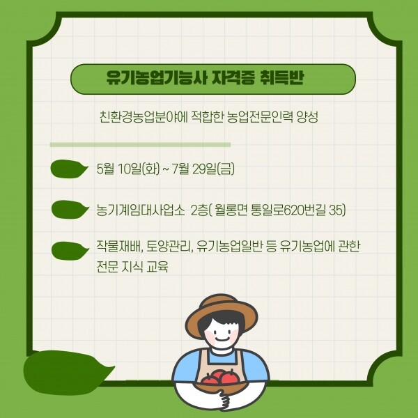 이번 교육은 유기농업기능사 자격증 취득을 위한 필기 및 실기 대비 교육 과정으로 파주시민 37명을 대상으로 5월 10일부터 7월 29일까지 농기계임대사업소 2층 회의실에서 실시하며 작물재배, 토양관리, 유기농업일반 등 유기농업에 관한 전문지식을 체계적으로 교육할 예정이다.