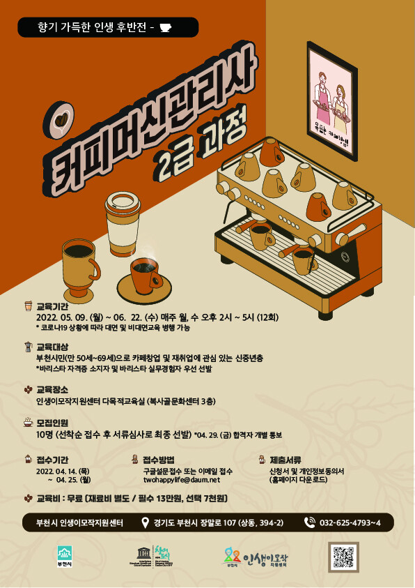이자원 부천시 인생이모작지원센터장은 “카페가 증가하고 있는 요즘 커피는 우리의 일상생활에서 뗄 수 없는 중요한 문화로 자리잡았다”며 “이번 교육으로 신중년 여러분이 멋있는 인생, 멋진 인생이모작에 성공하시기를 응원하겠다”고 말했다.