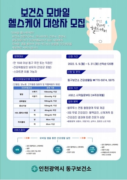 모바일 헬스케어 사업은 건강 위험군을 대상으로 모바일 앱을 통해 24주간 건강·운동·영양의 분야별 전문가가 1:1 맞춤형 건강관리 서비스를 제공하는 사업으로 보건소 방문 검진 3회를 제외하면 모든 서비스가 모바일을 통해 이뤄지므로 평소 직장생활로 인해 건강관리를 소홀히 하기 쉬운 30∼50대 성인에게 최적화된 서비스이다.