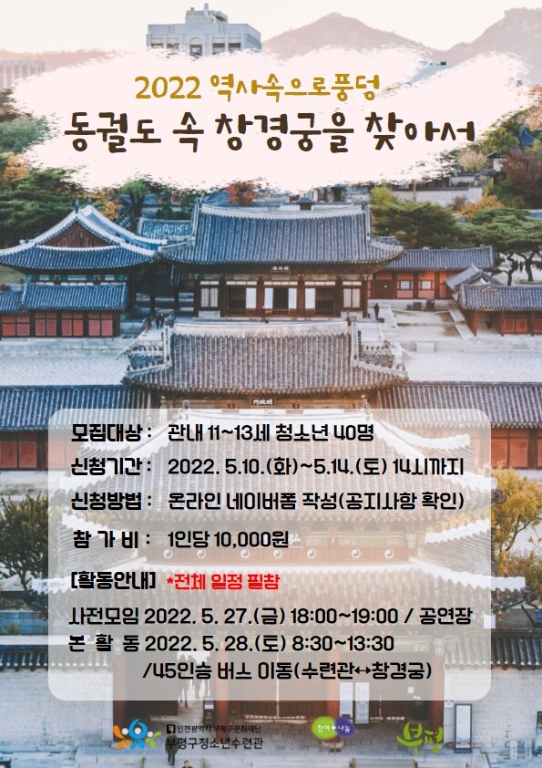 박건호 부평구 청소년수련관장은 “코로나19로 지친 청소년들이 창경궁을 체험하며 즐겁고 의미 있는 추억이 되길 바란다”고 말했다.