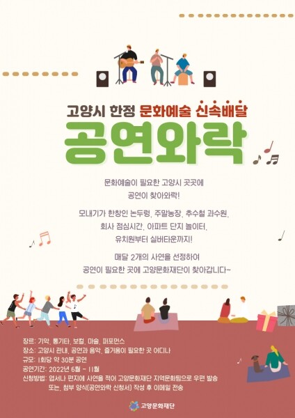 ‘고양시 한정 문화예술 신속배달’ 이라는 부제로 진행되는 ‘공연와락’은 시민이 원하는 시간에 원하는 장소로 찾아가 공연을 진행하는 프로그램으로 사회적 거리두기 전면해제에 따라 코로나로 인해 지난 2년간 멈췄던 시민들의 문화 향유 기회를 확대하고 공연을 통한 힐링과 소통의 시간을 선사하고자 기획됐다.