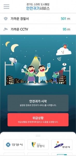 ‘안전귀가서비스’는 스마트폰 앱을 설치한 사용자가 늦은 밤 귀가 중이거나 위험한 상황에 직면했을 때 스마트폰을 흔들거나 SOS 버튼을 누르면 사용자 위치가 CCTV통합관제센터와 지정된 보호자에게 자동으로 전송되는 서비스이다.