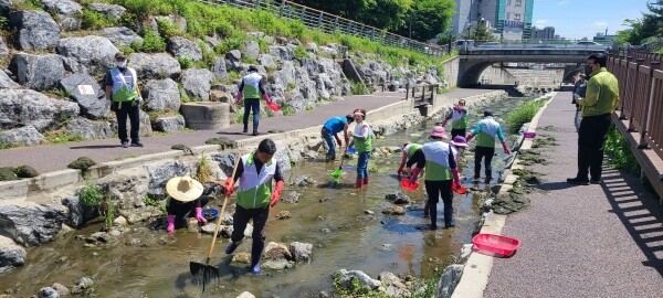 이에 화도읍 이장협의회는 근무조를 5개조로 나눠 고압살수기를 통해 바닥과 돌에 붙은 이끼를 세척해 제거하고 빗자루, 갈퀴 등으로 부유하는 이끼를 걷어내는 등 마석우천 생태계를 복원하기 위해 적극적으로 나섰다.