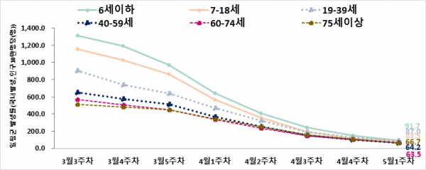 모든 연령대의 일평균 발생률이 전주 대비 감소했으나, 9세 이하 연령군에서 여전히 가장 높은 발생률을 유지 중이다.