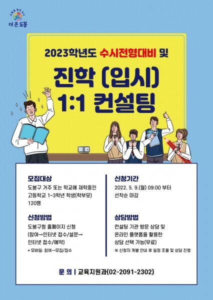 이번 입시컨설팅은 도봉구 거주 또는 학교에 재학 중인 고등학교 1~3학년 학생 120명을 대상으로 5월 9일 오전 9시부터 선착순 모집한다.