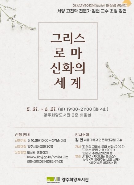 강연은 매주 화요일 오후 7시에서 9시까지 총 4회에 걸쳐 진행되며 강연신청은 도서관홈페이지 또는 양주희망도서관에 전화 신청하면 된다.