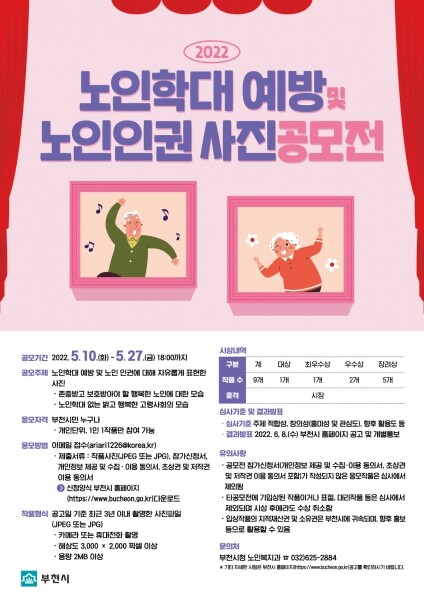 이번 공모주제는 노인학대 예방 및 노인 인권에 대해 자유롭게 표현한 사진으로 부천시민이면 누구나 참여할 수 있다.