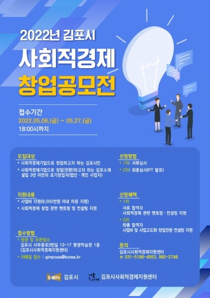 접수 마감은 5월 27일까지이며 김포시 또는 김포시사회적경제지원센터 누리집에서 신청서를 다운받아 작성 후 이메일·방문·우편을 통해 제출하면 되며 자세한 내용은 김포시 사회적경제지원센터로 문의하면 된다.